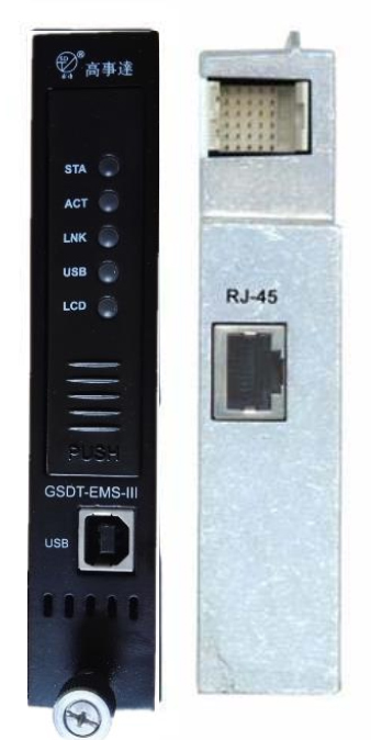 GSDT-EMS設(shè)備管理模塊位于光平臺第一個插槽之上,為光平臺提供本地(通過USB端口)或遠程(通過RJ45以太網(wǎng)端口)監(jiān)控能力。GSDT-EMS設(shè)計有設(shè)備控制程序,通過該程序,用戶可以使用計算機訪問光傳輸平臺的所有設(shè)備。該程序界面友好,使用方便,并能同步顯示所監(jiān)測設(shè)備之運行狀態(tài)。
