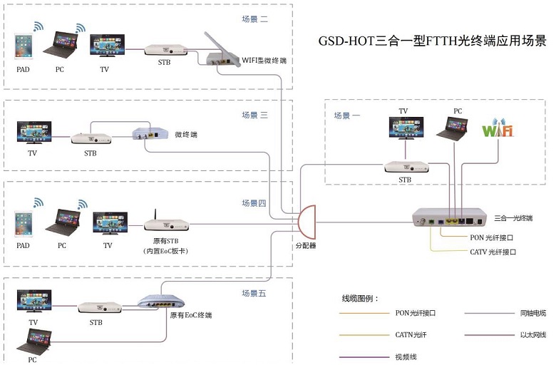 GSD-HOT 三合一型 FTTH 光終端是一款內置了 CATV 及 ONU 光模塊和同軸電纜調制解調模塊的無源光網絡終端。該產品基于成熟穩(wěn)定的 EPON 技術,并融合了千兆以太網交換技術和同軸電纜網 EoC 技術,不僅系統(tǒng) 可靠性高,而且組網部署方便,為 FTTH 網絡光纖入戶后駁接室內原有的同軸電纜網絡提供了一個便捷的 解決方案,使原有的 EOC 網絡設備(包括 EOC 終端和內置 EOC 模塊的雙向機頂盒)在不做任何改動的 情況下,就能方便地接入新建的 FTTH 網絡,并能同時支持寬帶上網和 VOD 點播等多個業(yè)務。